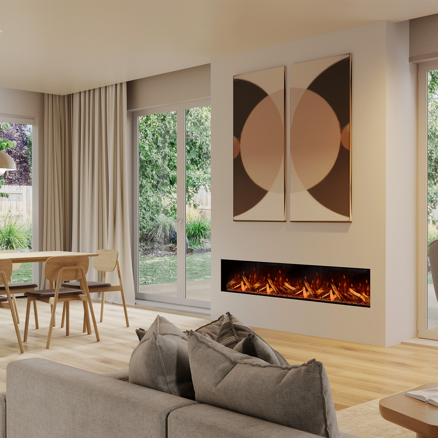 Een cinewall brengt televisie, opbergruimte en een elektrische sfeerhaard samen in één strak geheel.
